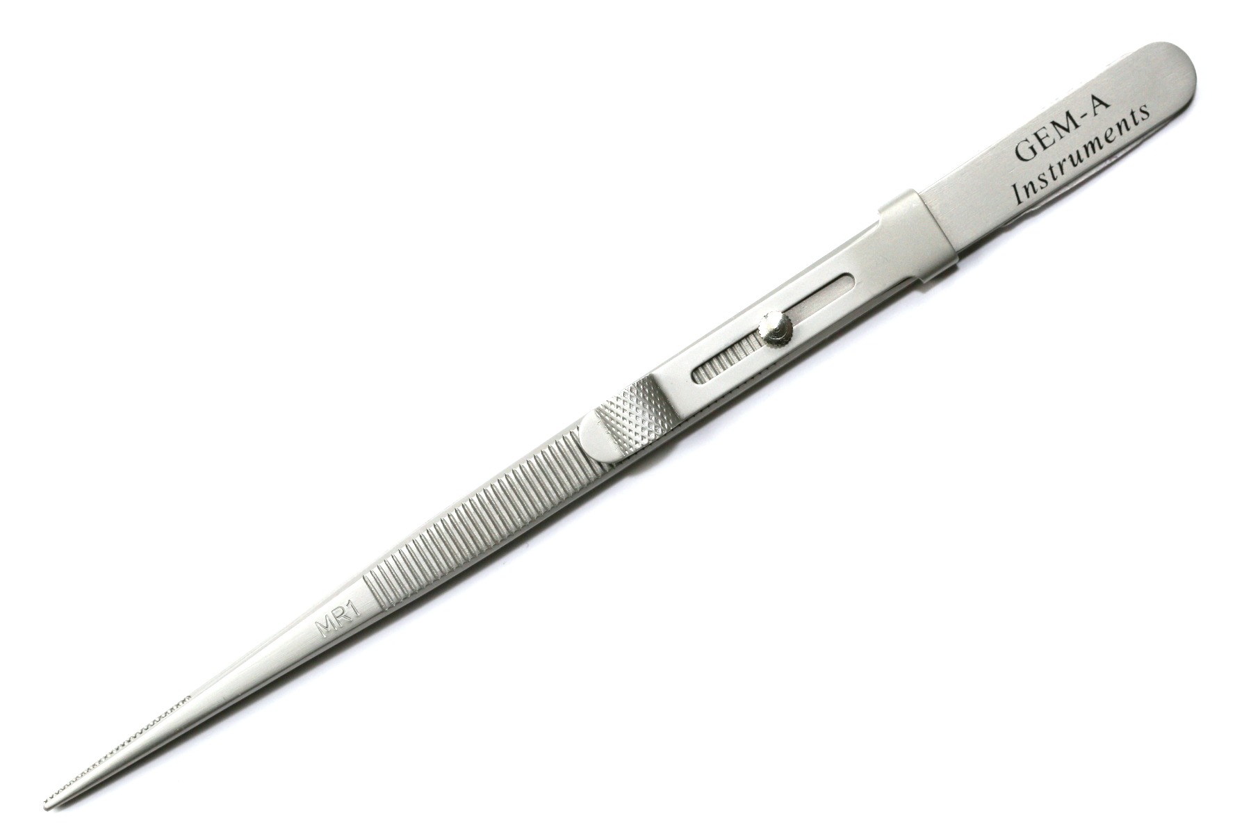Slide-locking tweezers with fine grooved tip for secure holding of gemstones. Supplied with a protective sleeve.